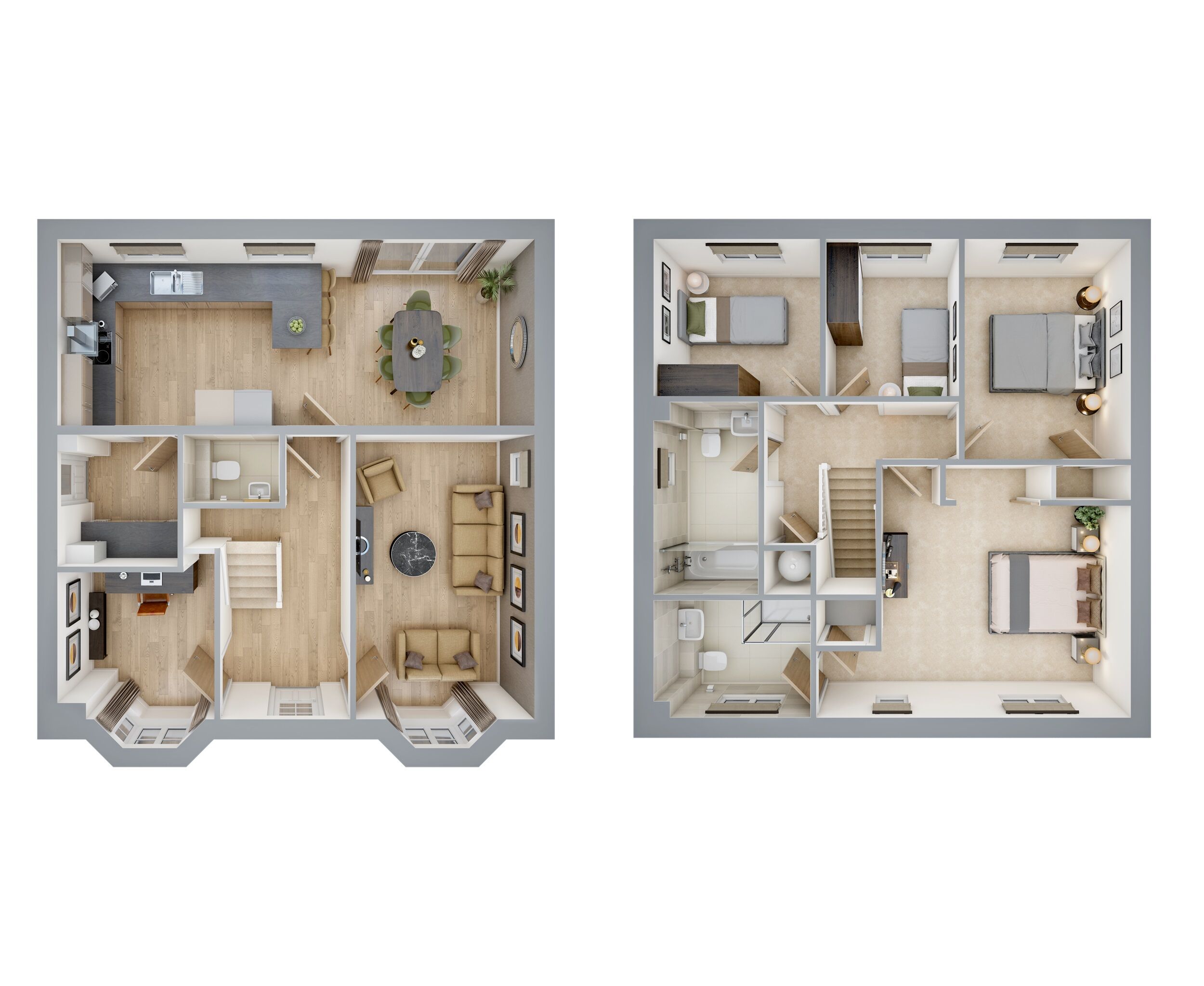 The Aspen is an EPC-A rated home designed for modern living. The bright hallway leads to a bay-windowed study area, a WC, and a spacious living room featuring a second bay window that fills the space with natural light. At the rear, a contemporary open-plan kitchen/dining area with French doors opens onto the south-east facing garden, while a dedicated utility room provides convenient outdoor access. Upstairs, bedroom one includes built-in wardrobes and a private en-suite, while a stylish family bathroom serves a double bedroom and two singles. This home also includes an electric vehicle charging point, a single detached garage and two parking spaces, and is available with Part Exchange.