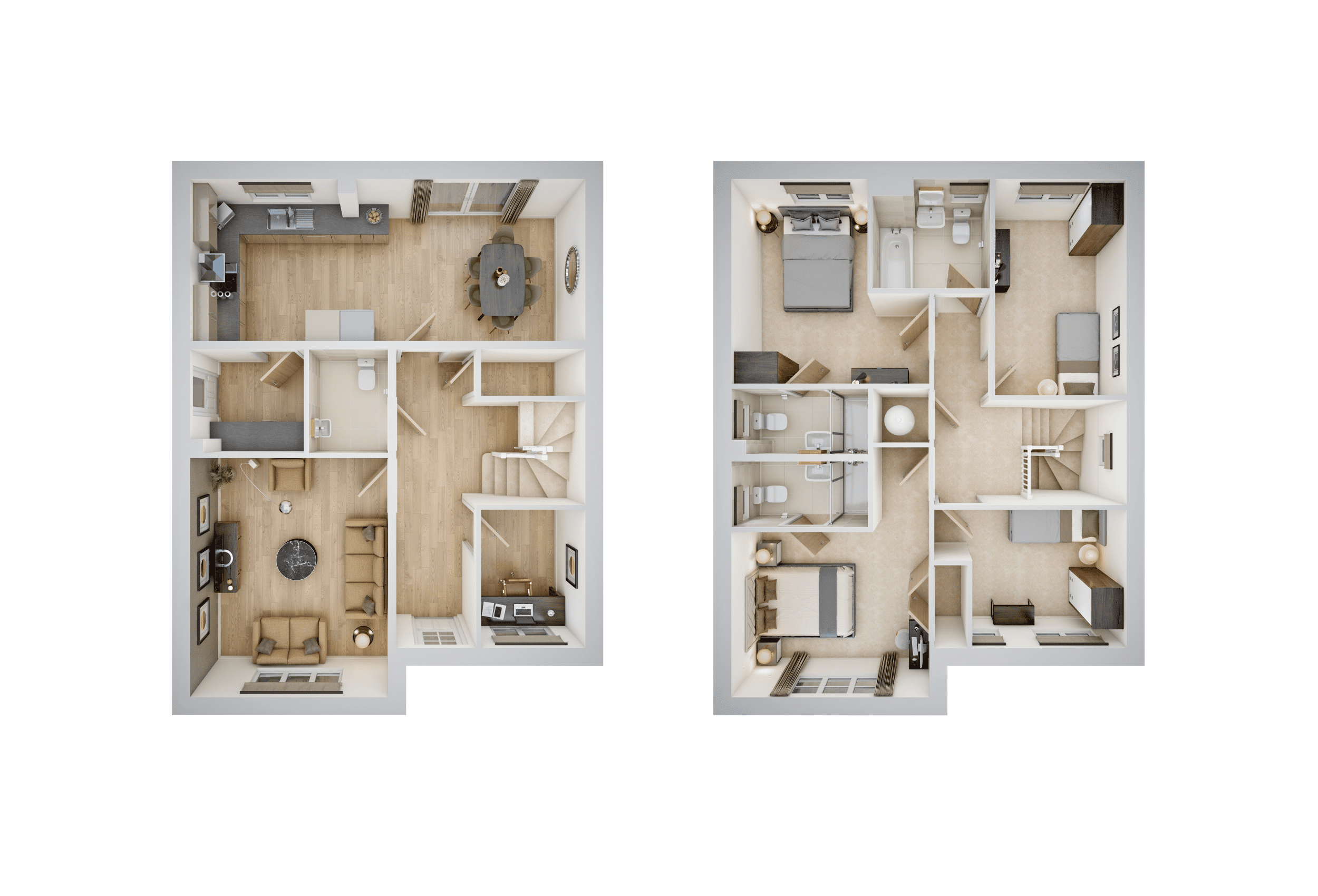 The Oakham offers generous living space and thoughtful design, perfect for modern family living. A spacious entrance hall leads to a front-aspect study – ideal for home working – and a large, light-filled living room at the front of the home. At the rear, a stylish open-plan kitchen and dining area opens onto the garden through French doors. A dedicated utility room with outdoor access, a convenient downstairs WC, and additional storage add everyday practicality. Upstairs, a wide landing connects four well-sized bedrooms. Bedroom one features built-in wardrobes and a private en-suite, while bedroom two also benefits from its own en-suite shower room. A sleek, contemporary family bathroom serves the remaining two generous bedrooms. This home also includes a single garage and two parking spaces with EV charging point.