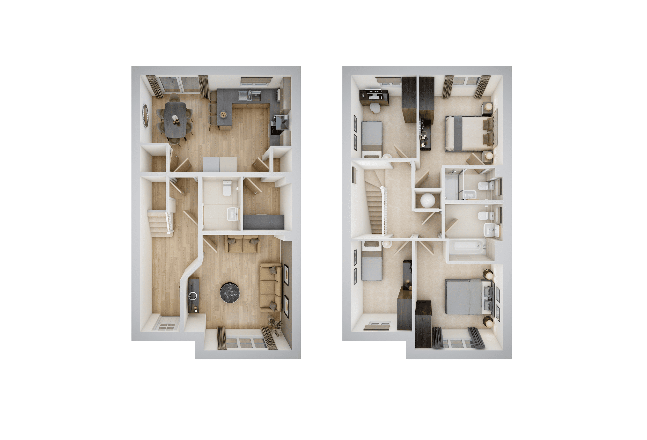 The Durham features a front-aspect living room, open-plan kitchen/dining with French doors, utility and WC. Upstairs offers two double bedrooms, one en-suite, two singles, a family bathroom, garage and two parking spaces.