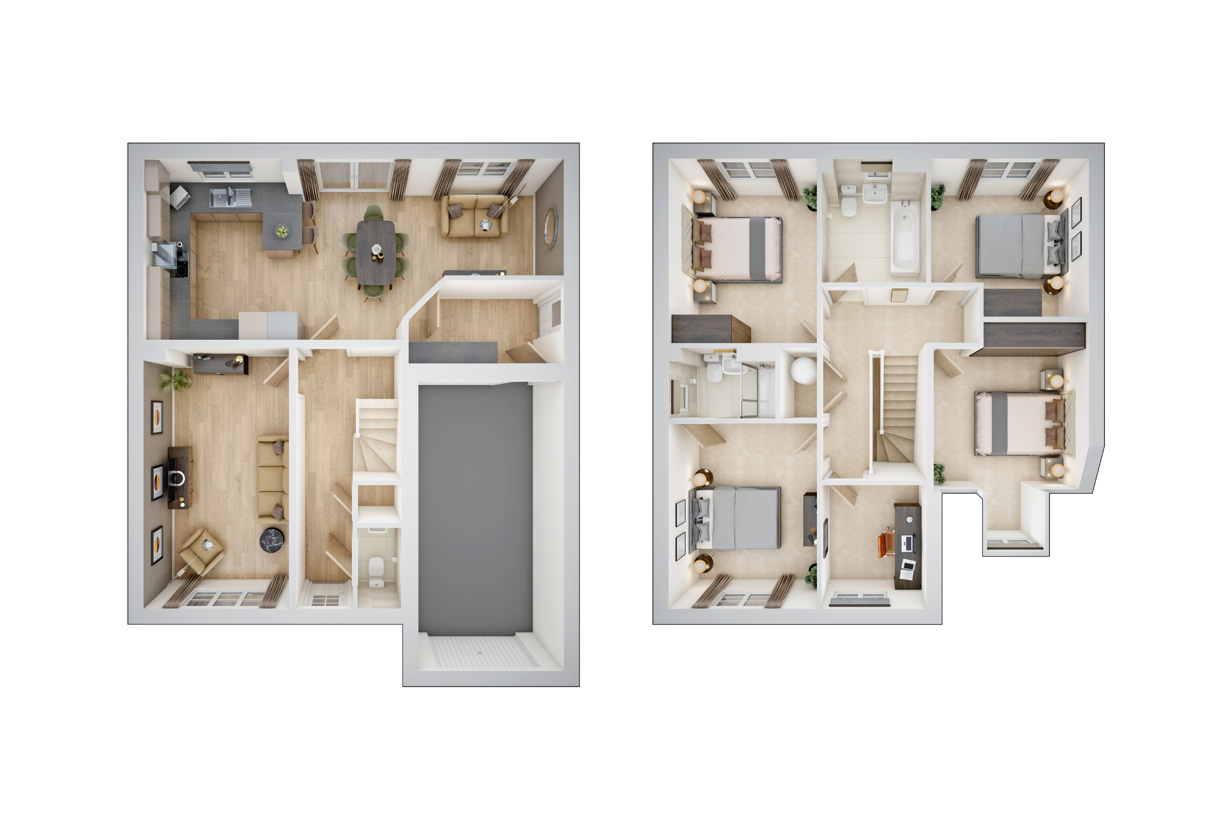 The Larch features a U-shaped kitchen with utility, a bright dining area, and a separate living room. Upstairs offers four double bedrooms, including an en-suite to bedroom one, plus a study. This home also includes a garage and two parking spaces.