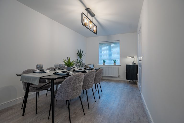 A modern design with a pretty first floor juliet balcony, this four bedroom home is spread over three storeys. A spacious hall provides an impressive entrance to the house. With the kitchen and a large family/dining area on the ground floor ideal for family living, attention has also been paid to storage, with a dedicated space under the stairs next to a downstairs WC.