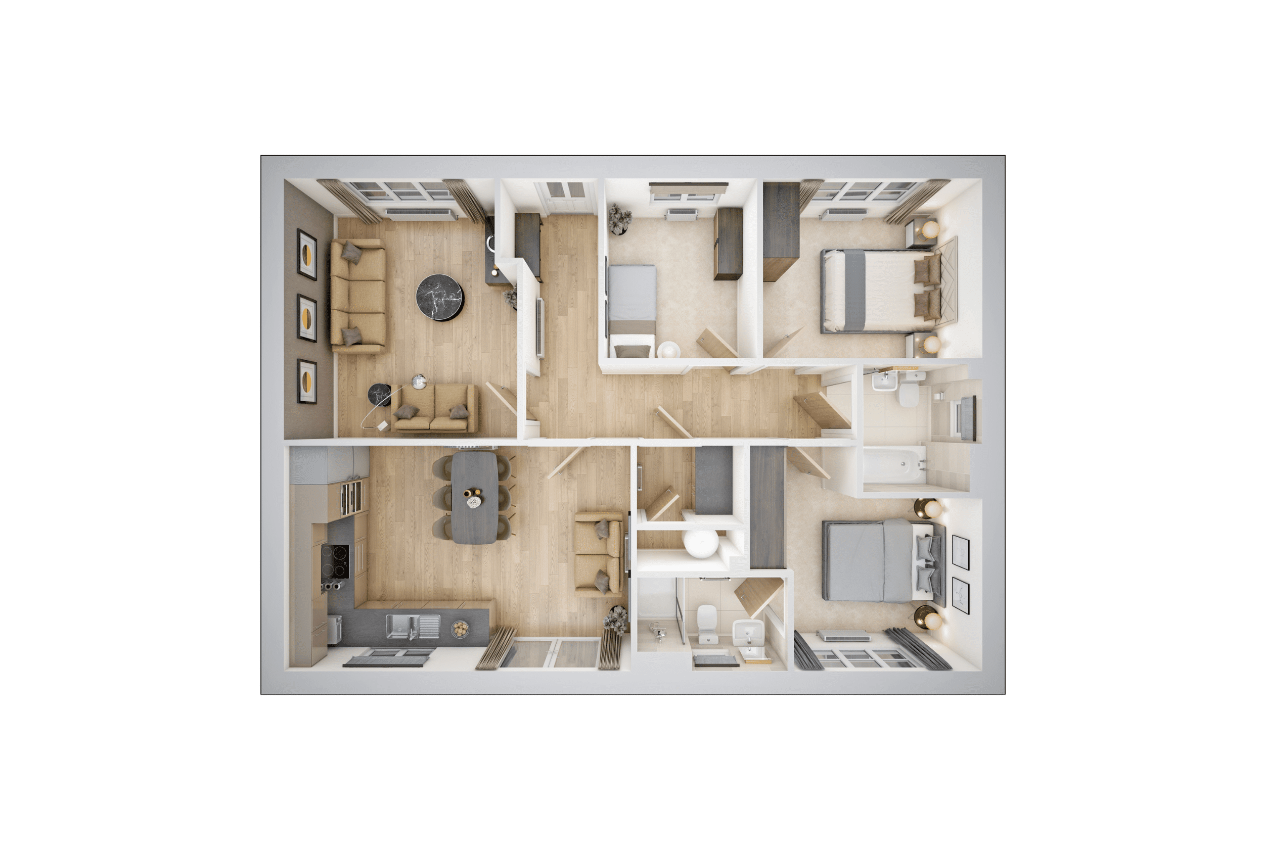 The Liscombe is a stylish single-floor home featuring twin French doors from the kitchen/dining area to a large rear garden. Bedroom one includes an en-suite, while the family bathroom serves the further two bedrooms.