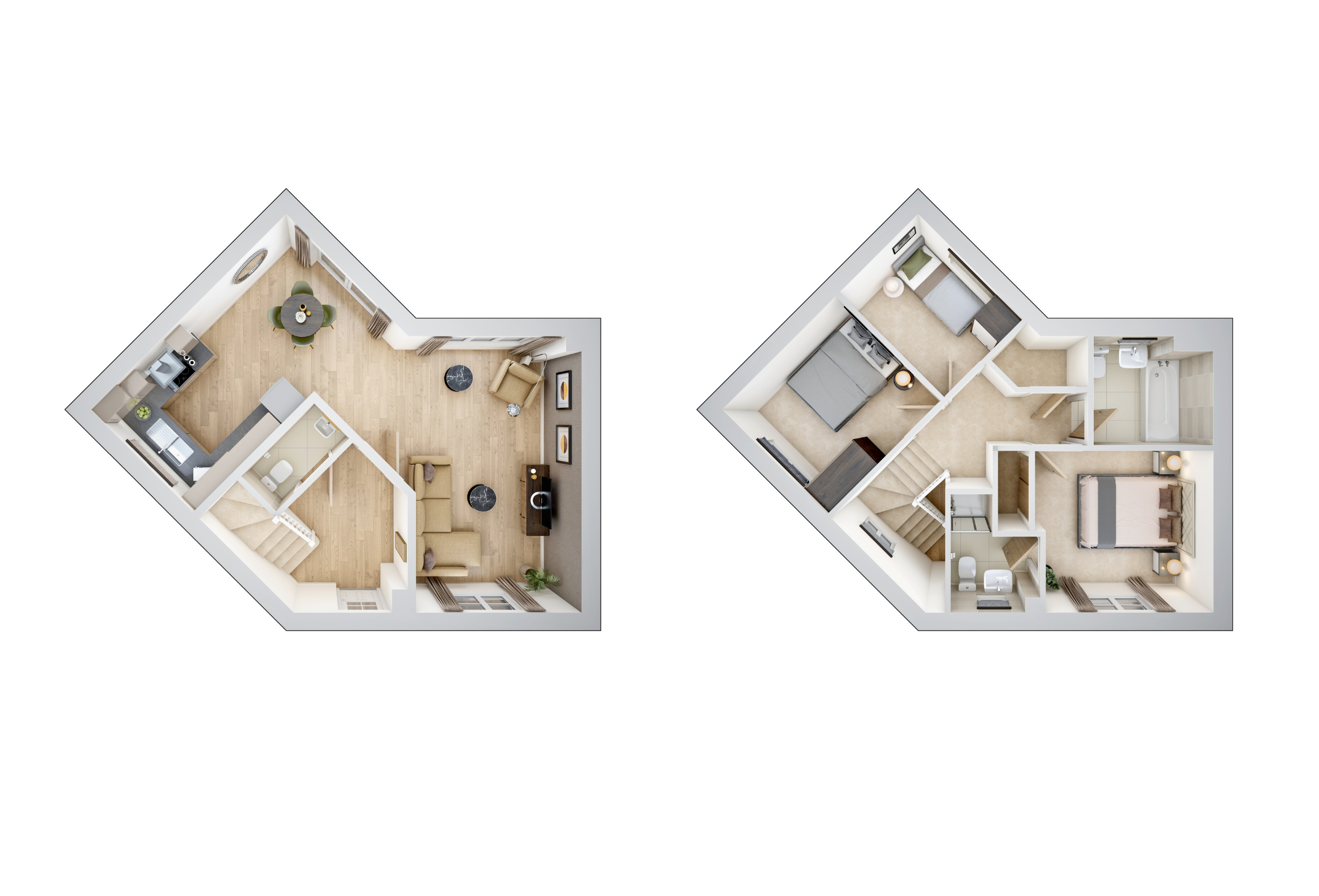 The Dogwood features an open-plan kitchen/dining area, dual-aspect living room, two double bedrooms, and a single, with an en-suite to bedroom one.