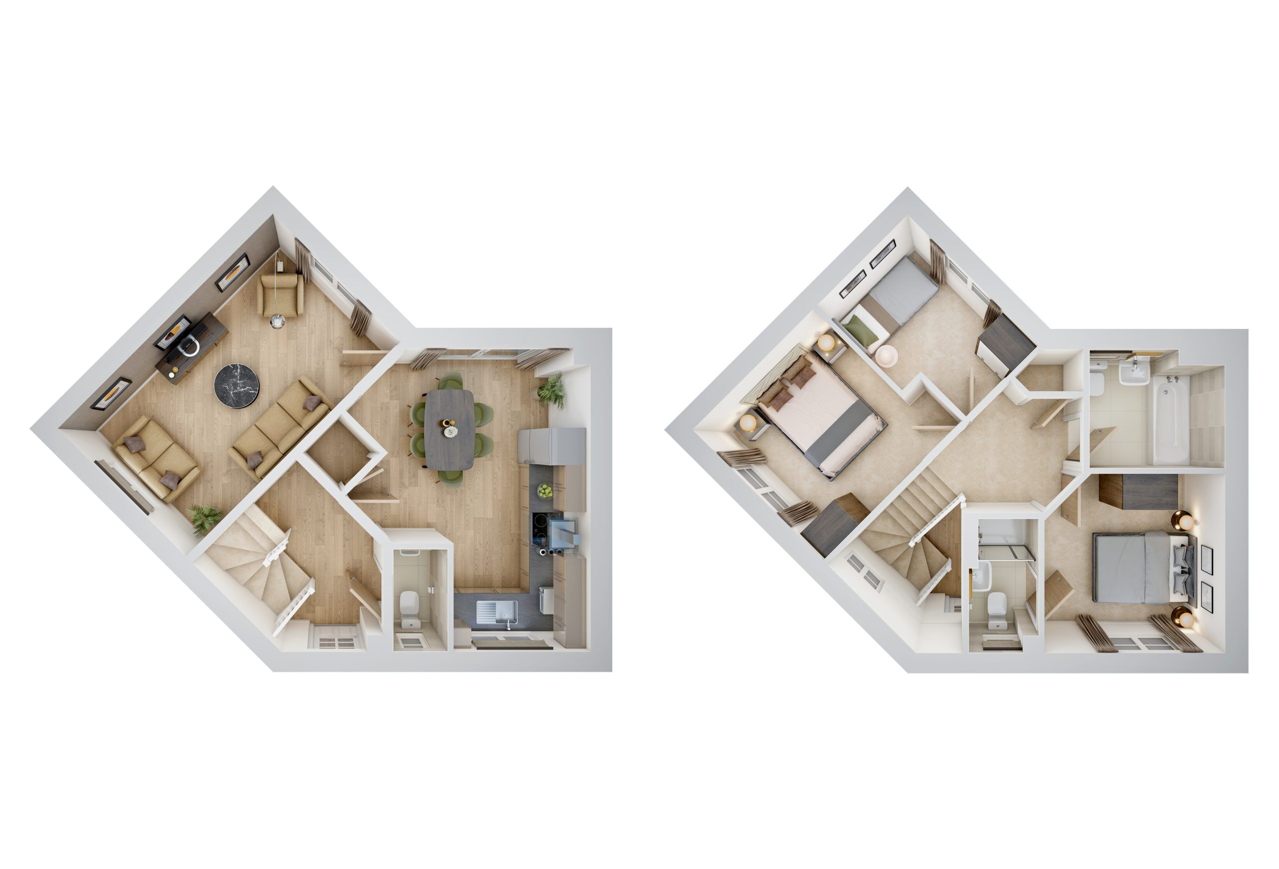 The Corby features a spacious entrance hall with a convenient WC, leading into a bright open-plan kitchen/dining area with French doors opening to the rear garden. At the back, a dual-aspect living room spans the length of the home, offering a light-filled space to relax. Upstairs, bedroom one enjoys a private en-suite, while a modern family bathroom serves a second double and a generous single bedroom. This home also includes two parking spaces.