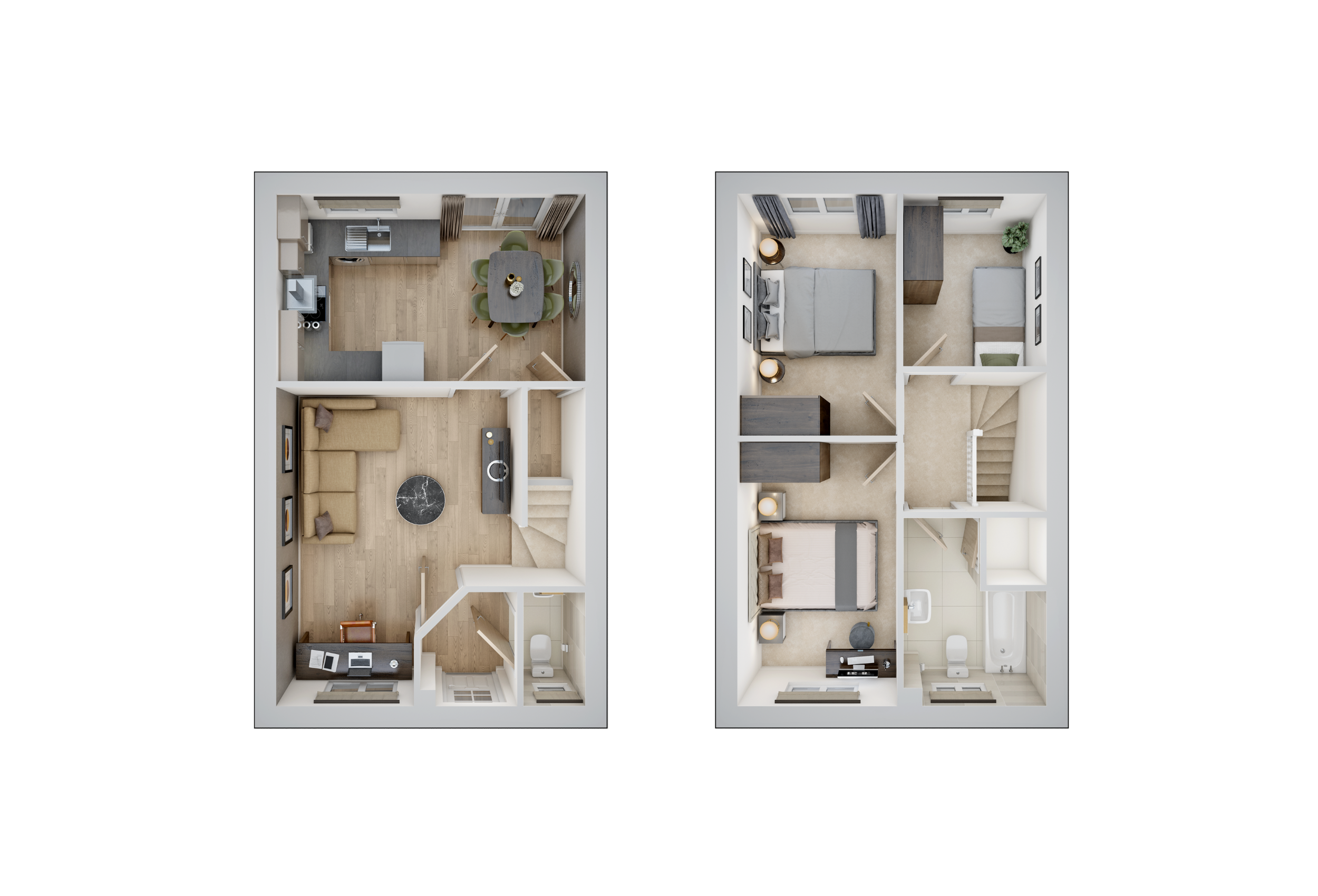 The Ashford features a spacious front living room, open-plan kitchen/diner with French doors to the rear garden and a downstairs WC. Upstairs offers two double bedrooms, one flexible single, plus a family bathroom. Includes two parking spaces.