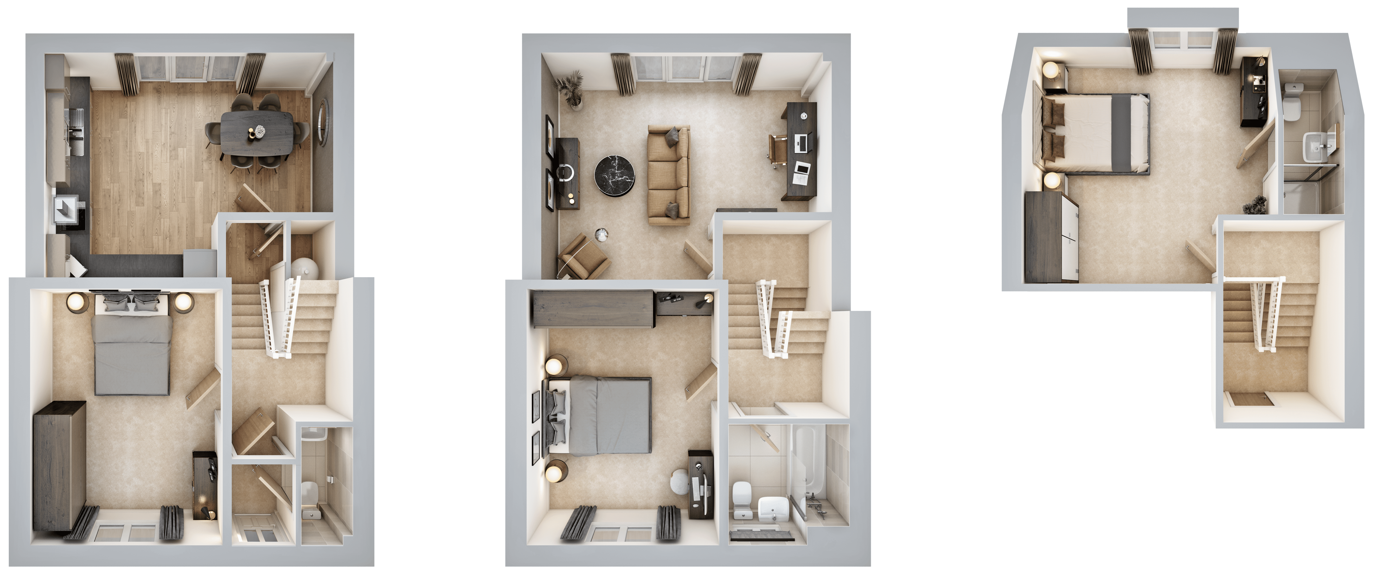 The Romney is a modern three-story home featuring an open-plan kitchen/dining area, a spacious living room with a Juliet balcony, and three versatile bedrooms, including a private top-floor main bedroom with an en suite.