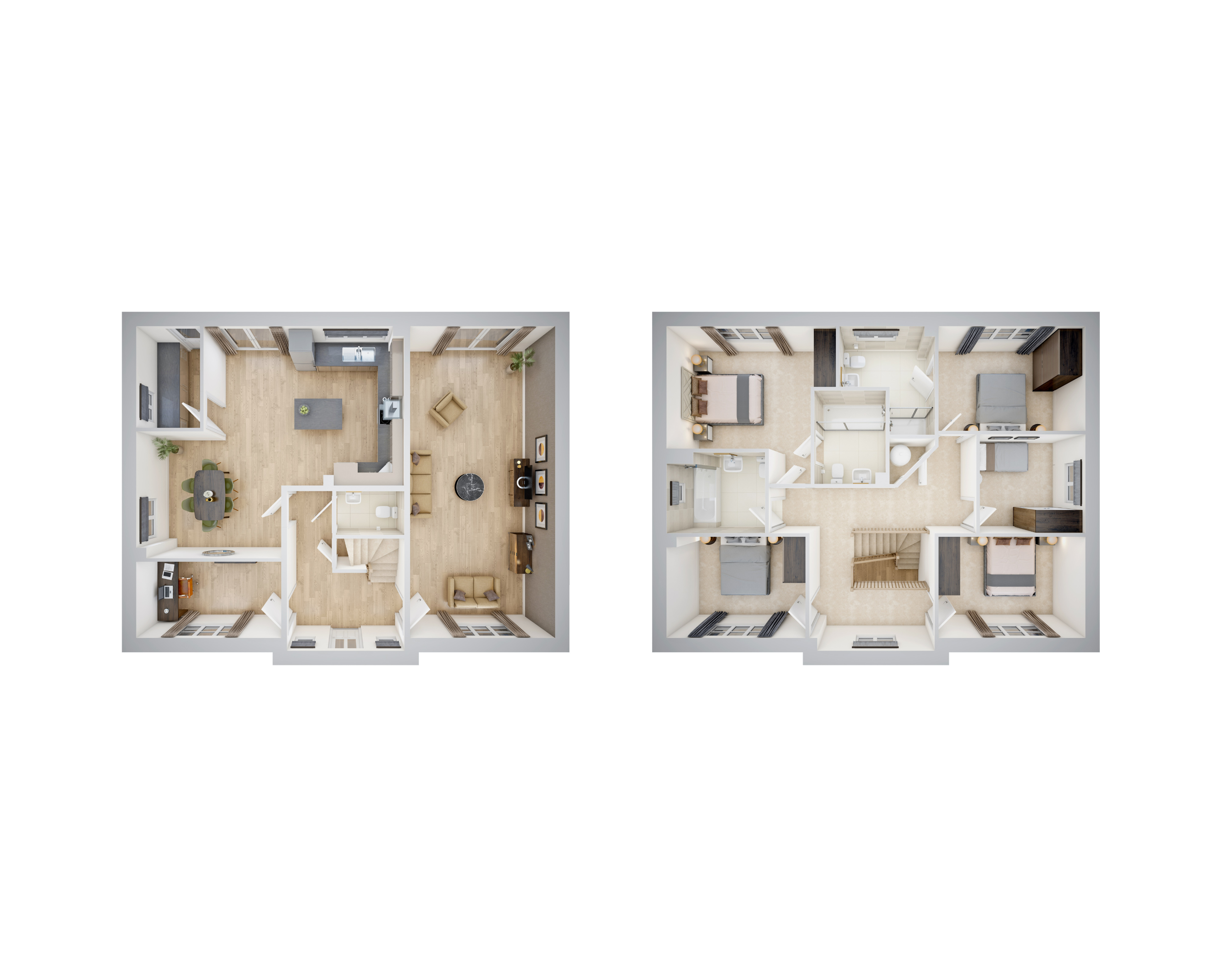 The Ash greets you with a generous entrance hall leading to a private front-aspect study, a downstairs WC, and a handy storage cupboard. To the right, a spacious living room extends the length of the home, with French doors opening onto the large wrap-around garden. At the rear, the heart of the home is a stunning open-plan space featuring a modern kitchen, family dining area, additional living space, and a second set of French doors leading outside. A dedicated utility room with outdoor access adds extra convenience. Upstairs, the spacious landing connects four generous double bedrooms and a versatile single. Bedrooms one and two each enjoy their own en-suite shower rooms with double sinks, while a contemporary family bathroom serves the remaining bedrooms. This exceptional home also includes a double garage and four parking spaces.
