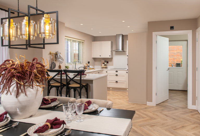 The Sycamore is an impressively designed family home, set within a private cul-de-sac and beautifully positioned overlooking open green space. A spacious entrance hall leads into a generous open-plan kitchen and dining area, forming a welcoming heart of the home, complemented by a dedicated utility room with outside access and a discreet downstairs WC. A bright dual-aspect living room offers an elegant space for both relaxing and entertaining, with French doors opening onto the impressive rear garden. Upstairs, the main bedroom enjoys fitted wardrobes and a private en-suite, while two further double bedrooms and a generous single are served by a large contemporary family bathroom.